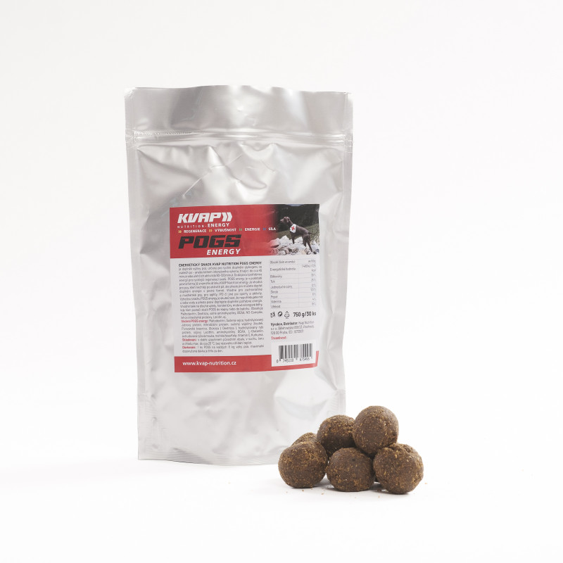 Snack énergétique KVAP Nutrition POGS energy - complément nutritionnel pour chiens, destiné à la reconstitution rapide du glycogène dans les muscles après - ou pendant un exercice intensif d'une durée allant jusqu'à environ 45 minutes (comme le mushing, le canicross, le canivtt, la trottinette, l'agility, etc...) ou pour des activités plus légères mais longues jusqu'à 90-120 minutes (canitrail, randonnée, chasse, mi distance, etc...).