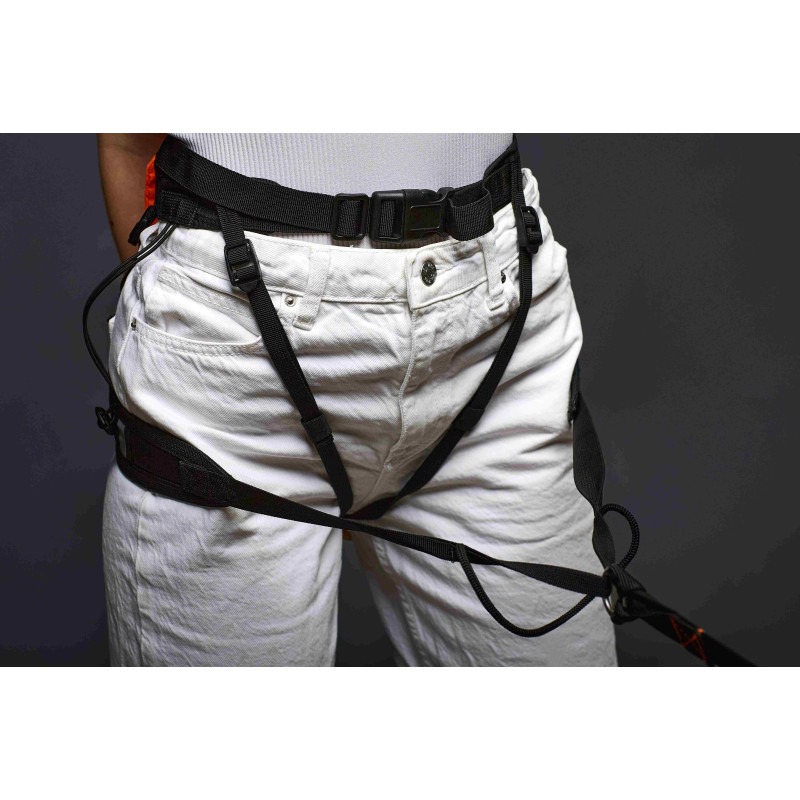 Une cordelette supplémentaire se trouve sur la sangle d'attache de la ligne de trait, pour éviter que l'anneau d'attache ne parte trop loin sur les cotés si le chien freine brusquement, s'il se trompe de direction ou s'il faite demi-tour.